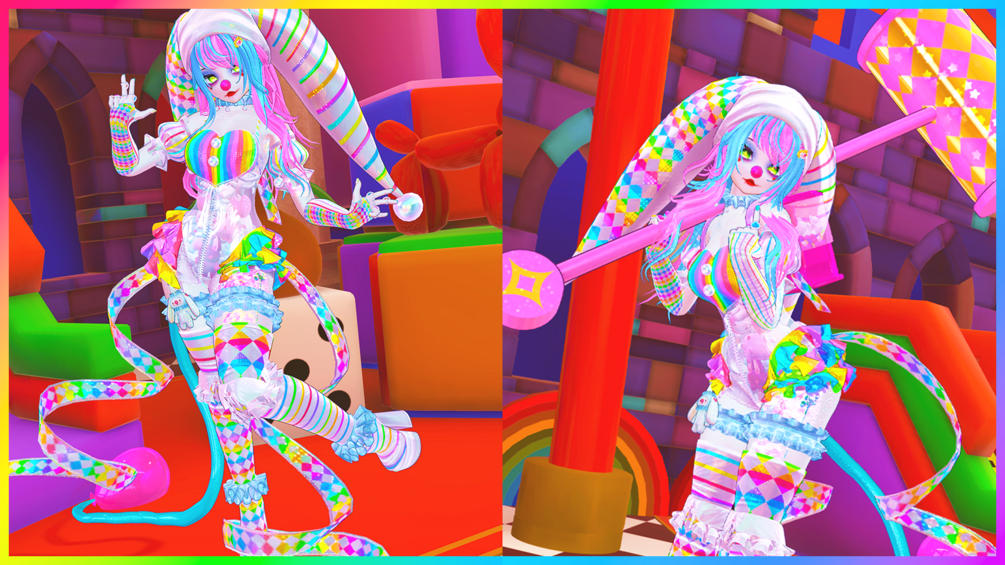 ♡ Physbones on: All hair, wrist balloons, flowtoys, chest, bum, carousel skirt, earrings, follower, both tails, hip ribbons, jester hat, tummy plushies, puffy sleeve pompoms