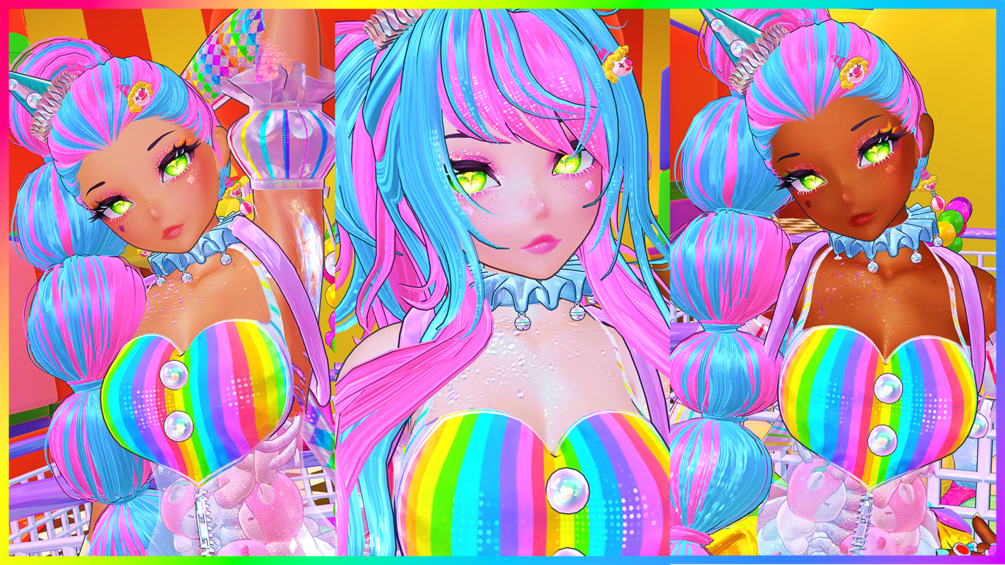 ♡ Physbones on: Chest, wrist balloons, both tails, all hair, bum, follower, earrings, carousel skirt, hip ribbons, jester hat, tummy plushies, puff sleeve pompoms