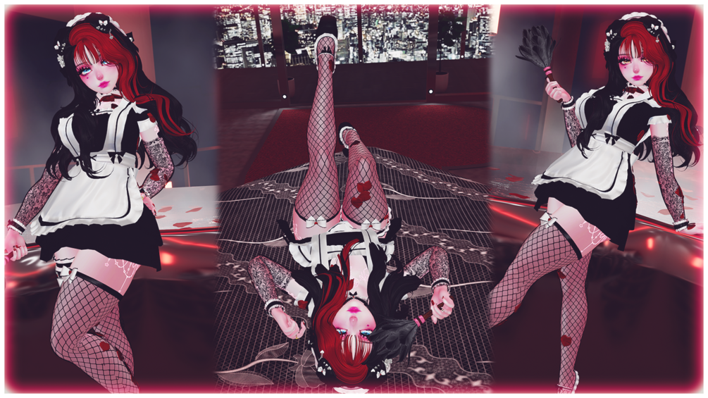 ♡ Maid assets & props - Maid dresses/frill collar/headband/shoes/wristcuffs, feather duster, a plate with a strawberry sandwich, a cup of espresso, & a spray and washcloth system that sprays water particles from the bottle and makes a noise when you spray the bottle (spray noise) or wipe with the cloth (squeaky noise)!