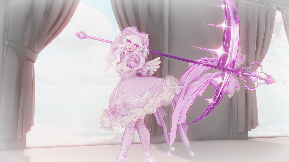 Nails, wings, choker, earrings, wavy hair, bun hair, headdress, tail kitty, stockings, long gloves, short gloves, frill heels, ruffle dress, magical heels, magical dress bow, flowtoys, tattoos, lollipop