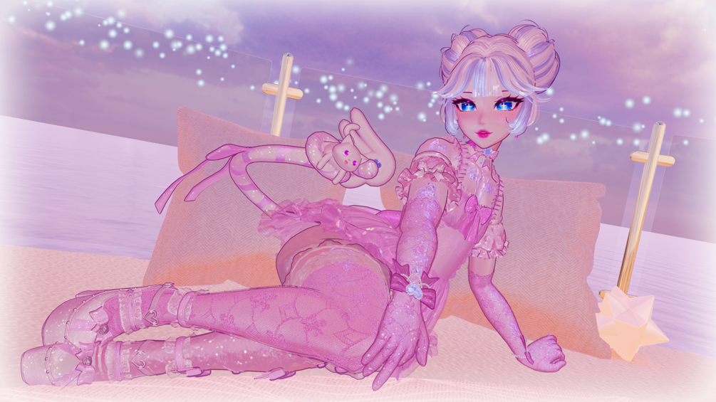 Body / Head / Magical dress, dress bow, headdress, ribbon heels, outerwear top, short gloves, top, scythe / Ruffle dress / Babydoll dress, choker, frill heels, long gloves, stockings /Arm cuff sleeves, undies, studded heels / Blo*mers / Pants / Pigtails hair set / Wavy hair / Bun hair / Tail, tail kitty, ears / Nails / Scythe bl*od / Lollipop / Flowtoys / Earrings / Hand sparkles / Interactions
